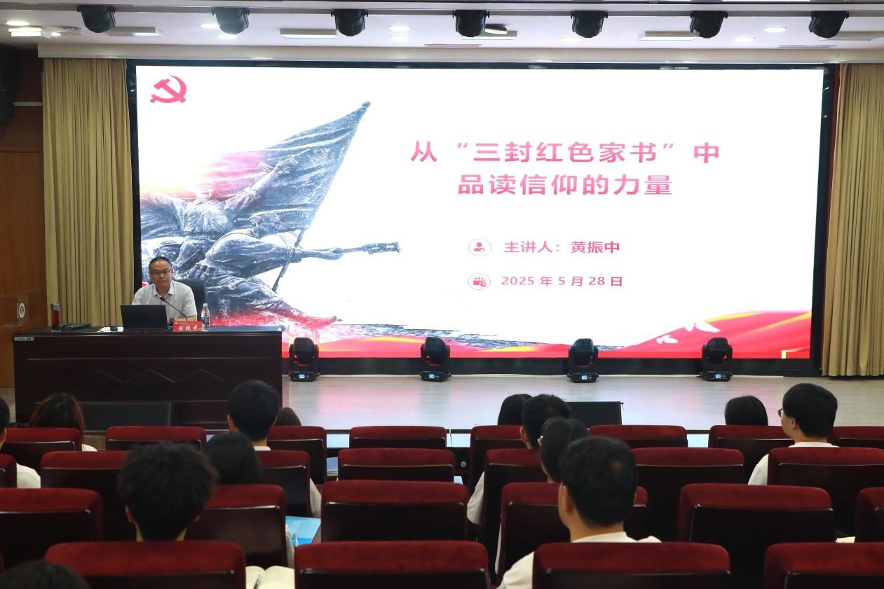 为深入学习贯彻习近平新时代中国特色社会主义思想,进一步激发青年学生的爱国情怀和历史使命感,2025年5月28日,副校长黄振中以“从‘三封红色家书’中品读信仰的力量”为专题,在郑州校区为信息工程学院学生讲授了一堂生动而深刻的思政课。