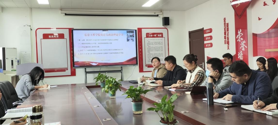 2025年4月8日,信息工程学院党总支组织郑州校区、开封校区全体党员及教职工,开展深入贯彻中央八项规定精神学习教育专题学习会。本次学习会由信息工程学院党总支书记崔琳领学。主要学习内容有:1.第一议题:原文学习《习近平关于加强党的作风建设论述摘编》(1)党的作风关系人心向背,决定党和国家事业成败(2)作风问题本质上是党性问题;2.2025-3-27 教育强国建设三年行动计划综合改革试点部署推进会召开3.2025-3-28 深入学习贯彻全国教育大会精神 开创教育强国建设新局面。