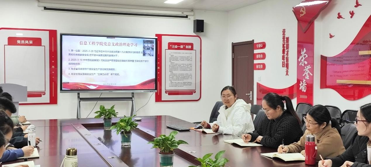 2025年3月11日,信息工程学院党总支组织郑州、开封两校区全体党员及教师,在郑州校区A514、开封校区F314以腾讯会议视频连接,开展政治理论学习活动。本次学习活动由信息工程学院副院长夏丽珍主持,全体党员及教职工参加会议。主要学习内容有:1.第一议题:习近平在中共中央政治局第十九次集体学习时强调 坚定不移贯彻总体国家安全观 把平安中国建设推向更高水平;2. 《中国纪检监察报》河南坚持严管厚爱结合激励约束并重 引导党员干部守底线敢担当;3. 河南省党政领导干部安全生产责任制实施细则;4. 河南省落实落细安全生产“三厚三必须”若干规定。
