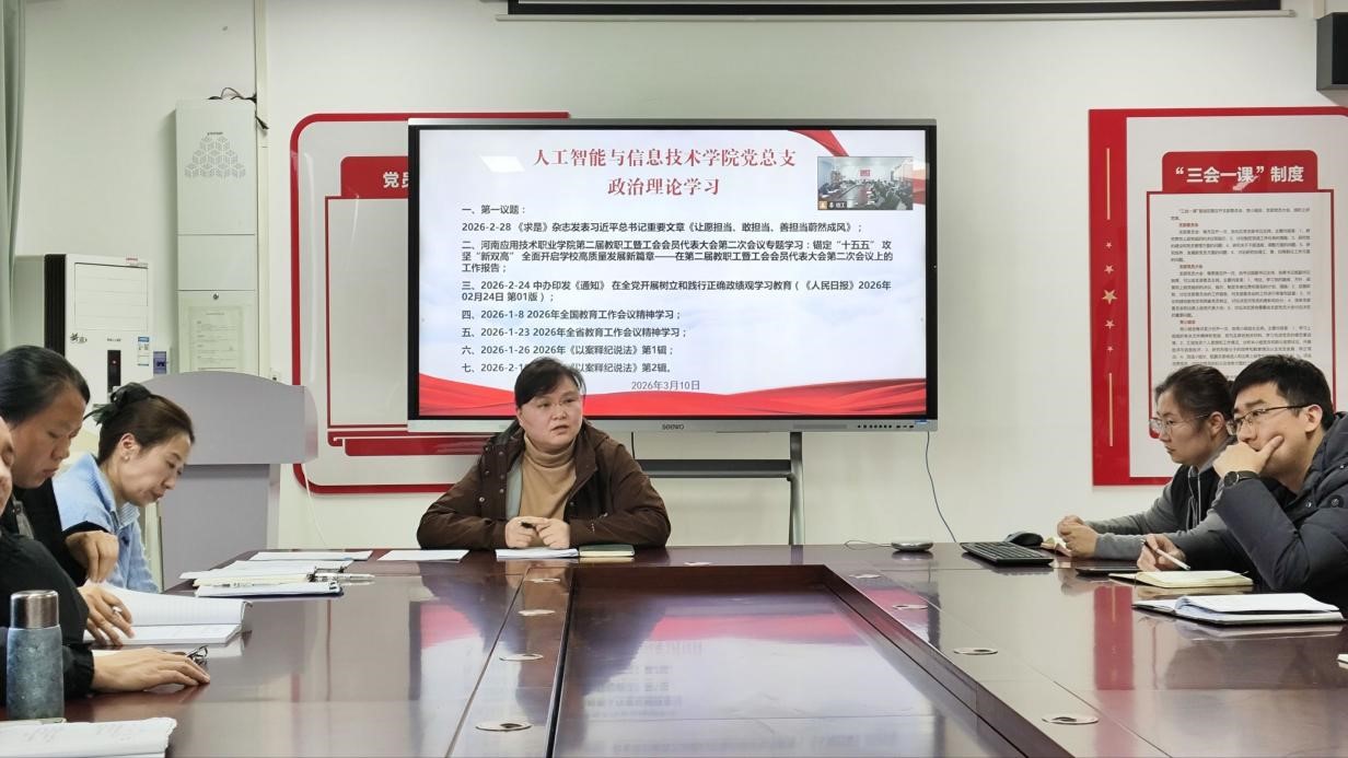 2026年3月10日,开云kaiyun官方网站党总支组织郑州和开封校区全体党员及教职工,开展政治理论学习活动。本次学习活动由开云kaiyun官方网站崔琳书记主持。主要学习内容有:1.第一议题:2026-2-28《求是》杂志发表习近平总书记重要文章《让愿担当、敢担当、善担当蔚然成风》;2.河南应用技术职业学院第二届教职工暨工会会员代表大会第二次会议专题学习:锚定“十五五”攻坚“新双高”全面开启学校高质量发展新篇章——在第二届教职工暨工会会员代表大会第二次会议上的工作报告;3.2026-2-24中办印发《通知》在全党开展树立和践行正确政绩观学习教育(《人民日报》2026年02月24日第01版);4.2026-1-8 2026年全国教育工作会议精神学习;5.2026-1-23 2026年全省教育工作会议精神学习;6.2026-1-26 2026年《以案释纪说法》第1辑;7.2026-2-10 2026年《以案释纪说法》第2辑。
