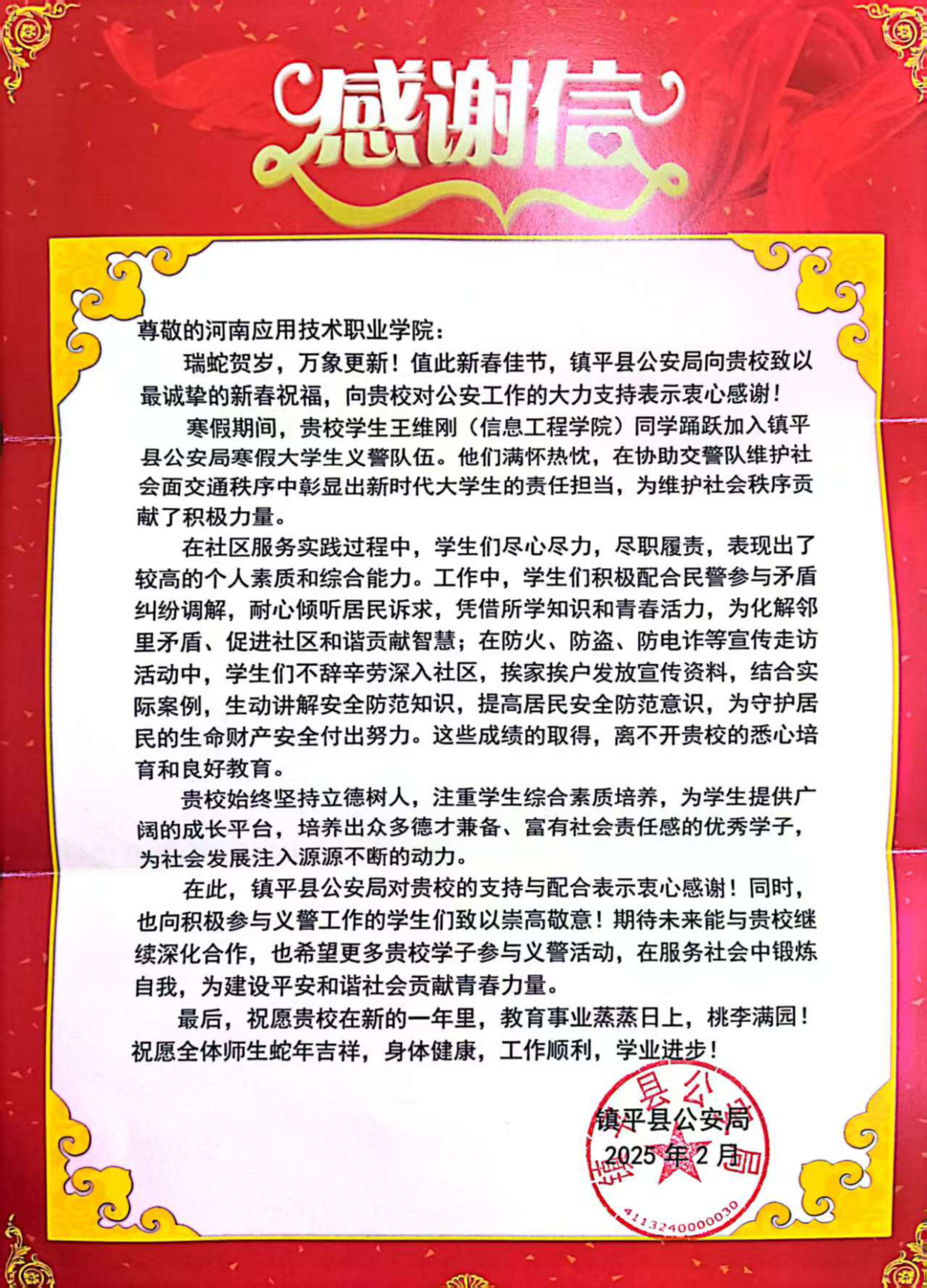 2月21日,信息工程学院收到来自河南省南阳市镇平县公安局的感谢信,信中表达了对我院学生王维刚寒假期间加入镇平县公安局寒假大学生义务警队,协助指挥交通、维护交通秩序的赞扬,也对学校育人成果表示感谢。