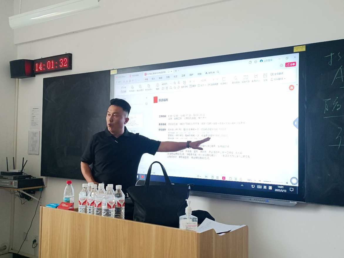 为深化校企合作、搭建人才供需桥梁,推动2026届毕业生高质量就业,2025年5月12日杭州陆汇智能科技有限公司、浙江兆奕科技有限公司受邀至信息工程学院开展专场宣讲会。宣讲会在开封校区开展,2026届毕业生参加。