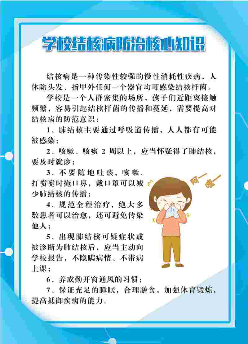 一般而言,连续咳嗽、咳痰两周以上,或咯血、血痰等,就被视为肺结核可疑症状者。发现疑似结核症状应当第一时间报告学校,并及时到正规医院检查确诊和规范治疗,以免自行服药致使症状迁延不愈,甚至传染给身边同学。其实,结核病可防可控可治,并不可怕,只要早期发现并采取科学合理的治疗手段,其治愈率非常高,且越早治疗效果越好。