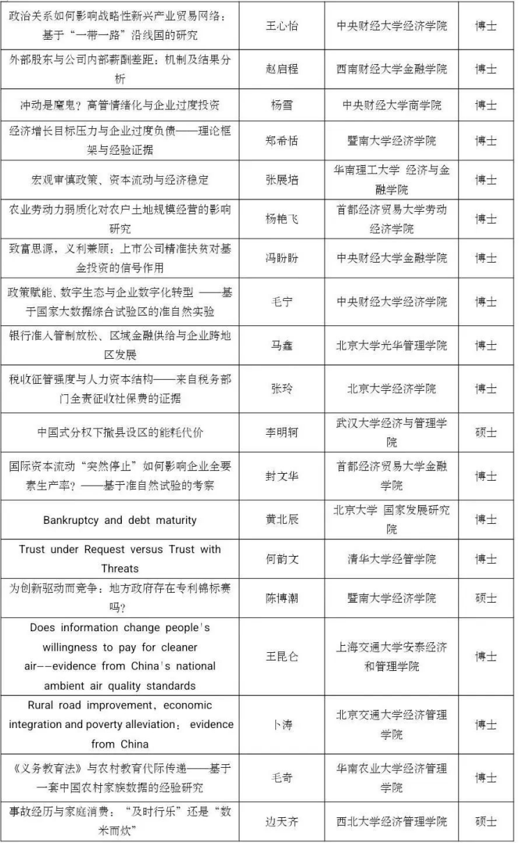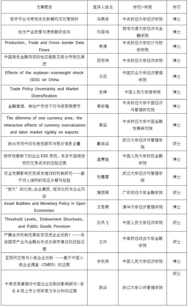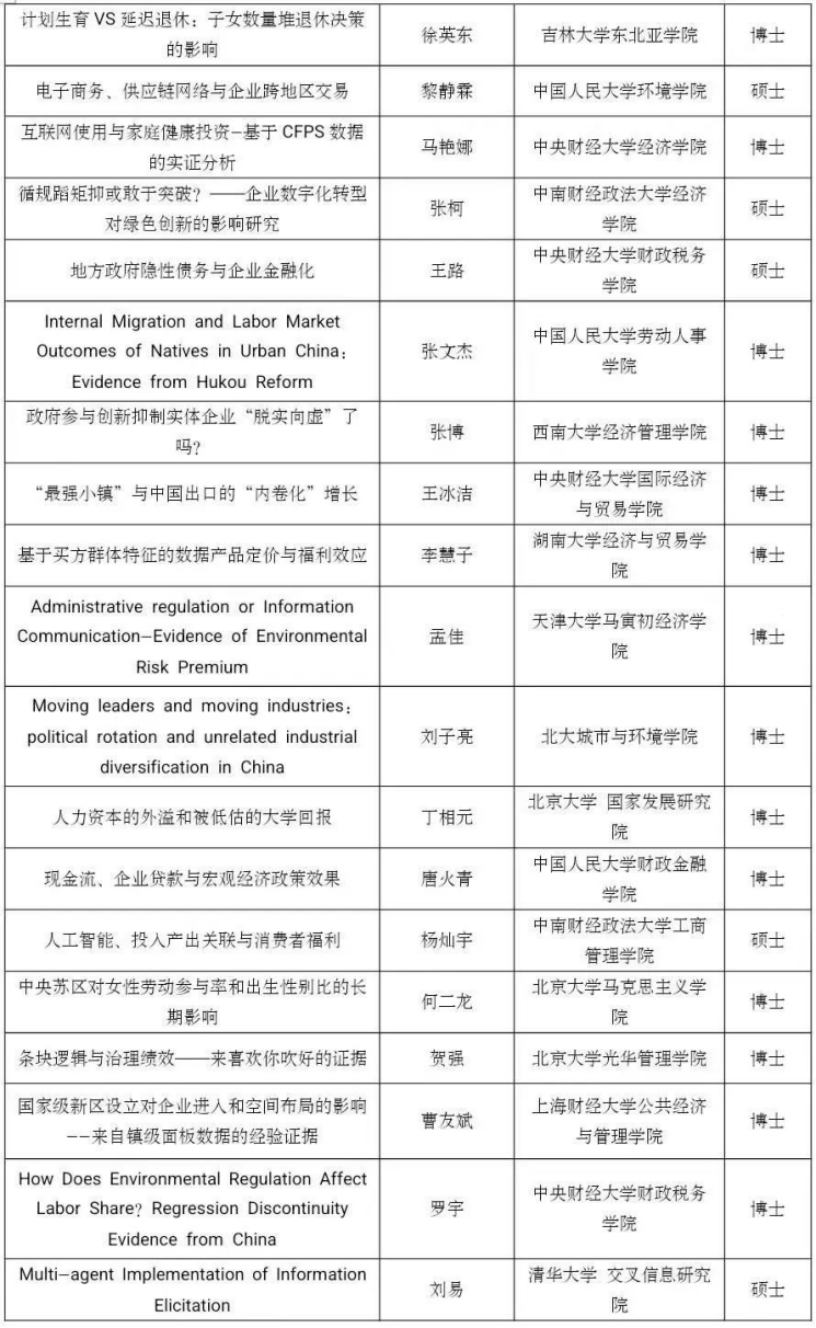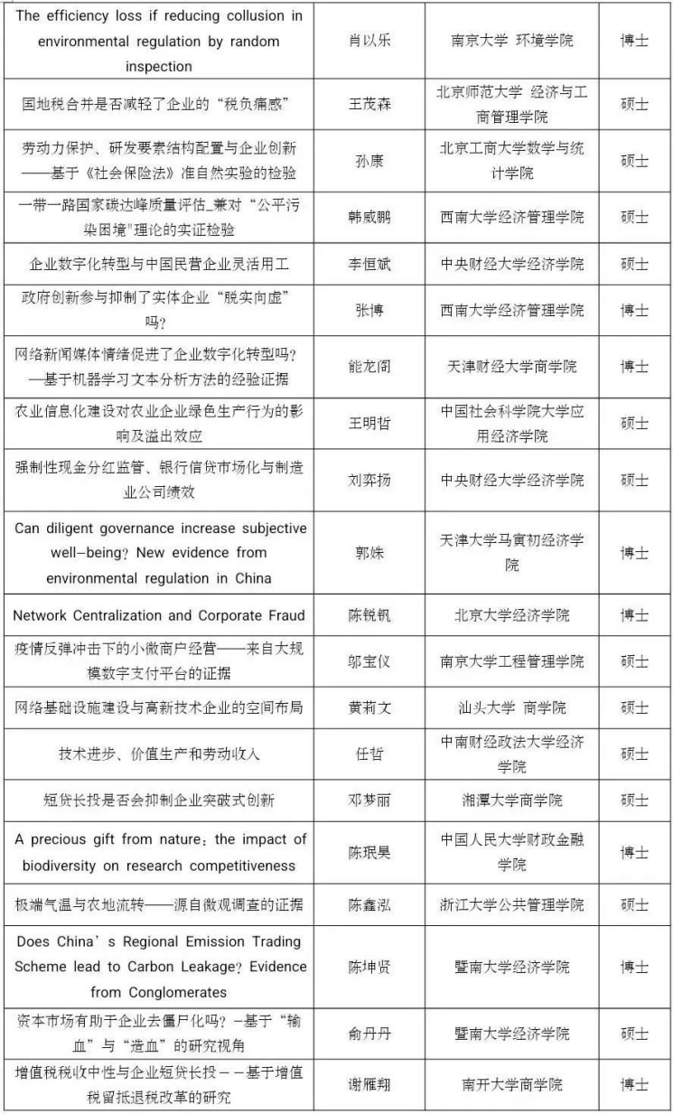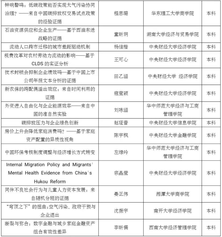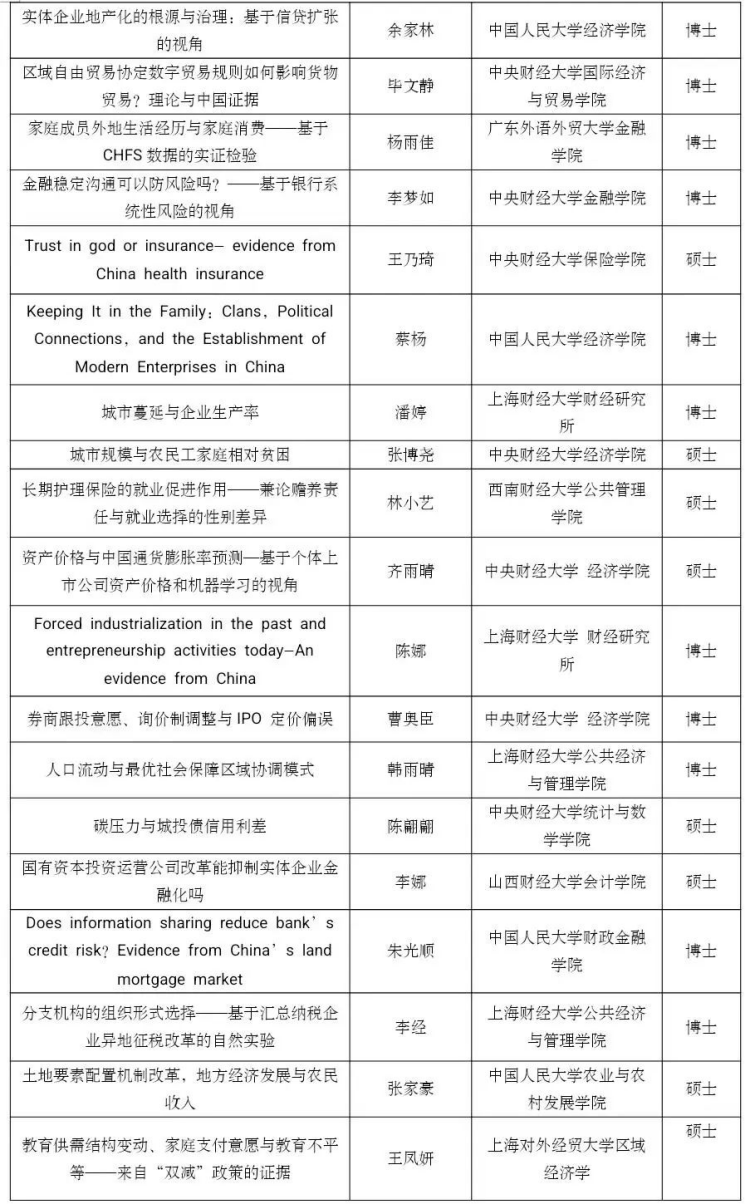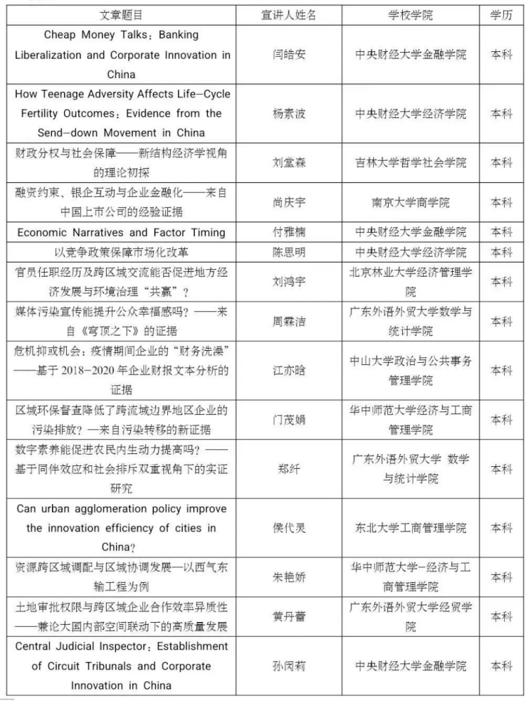 党的二十大报告指出,“教育、科技、人才是全面建设社会主义现代化国家的基础性、战略性支撑”。为了学习、贯彻和落实党的二十大关于教育和人才建设的精神,今年会jinnianhui官网联合中国经济学年会、中国青年经济学家联谊会主办第五届未来经济学家论坛。本论坛坚持“公平、公正、公开”的原则,鼓励思想争鸣、学术创新,旨在为未来有志于从事经济学研究的全国高校在校学生(本科生和研究生)提供一个观点交流、思想碰撞的学术交流平台。本次论文征集环节共收到612篇投稿论文,经过评审论证和评审,最终遴选出126篇入围会议,名单如下,恭喜各位入选的同学: