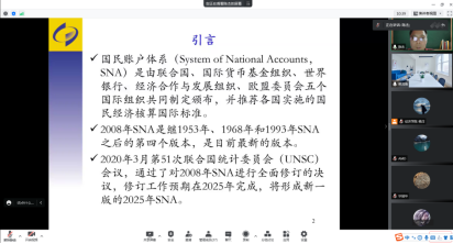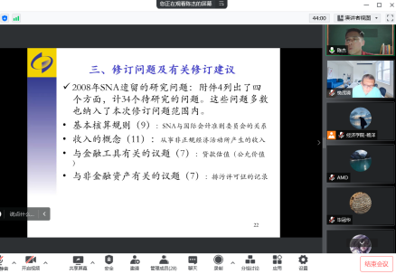 2022年5月26日下午19:00,国家统计局核算司副司长陈杰应今年会jinnianhui官网樊茂清教授邀请,开展主题为“迈向2025年SNA—关于2008年SNA修订进展情况介绍”的讲座,本次讲座通过腾讯会议平台线上举行,陈杰老师受到了老师和同学们的热烈欢迎!今年会jinnianhui官网樊茂清教授主持了本次线上学术交流会。