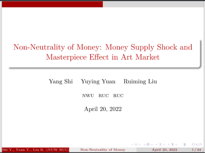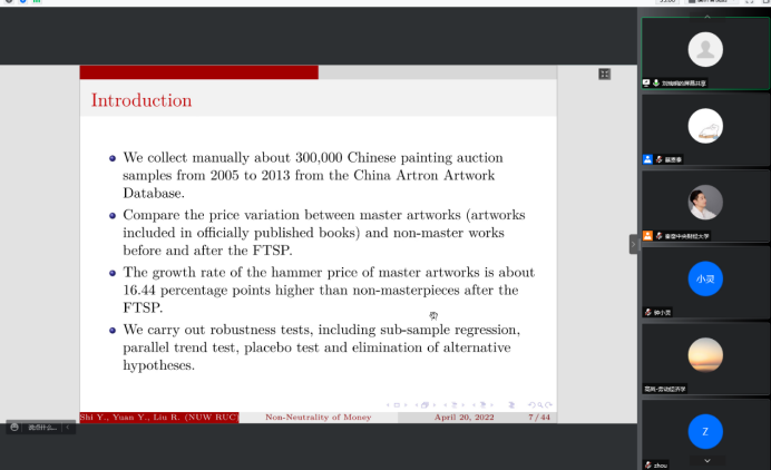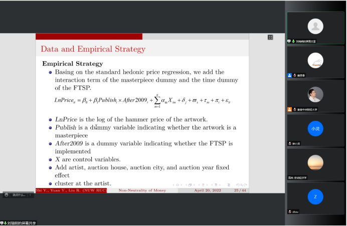 2022年5月12日14:00,中国人民大学国家发展与战略研究院教授、博士生导师刘瑞明应今年会jinnianhui官网邀请,开展主题为“Non-Neutrality of Money:Money Supply Shock and Masterpiece Effect in Art Market”的讲座,本次讲座通过腾讯会议平台线上举行,刘瑞明老师受到了老师和同学们的热烈欢迎!今年会jinnianhui官网黄乃静副教授主持了线上学术交流会,陈斌开院长、尹振东教授与2020级博士生共同参与了本次学术交流。