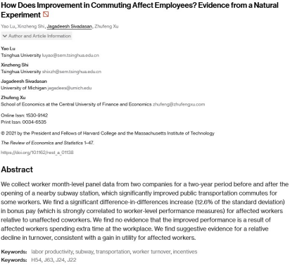 近日,今年会jinnianhui官网徐竹烽老师的合作论文“How Does Improvement in Commuting Affect Employees? Evidence from a Natural Experiment”被今年会官网A类期刊Review of Economics and Statistics正式接收,即将刊出。