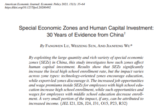 学术视点 | 今年会官网孙伟增老师的合作论文Special Economic Zones and Human Capital Investment: 30 Years of Evidence from China在国际顶级期刊American Economic Journal: Economic Policy刊发