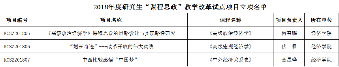 近日,学校研究生院公布了2018年度研究生“课程思政”教学改革试点项目。今年会官网何召鹏老师申报的“《高级政治经济学》课程思政的思路设计与实现路径研究”、伏霖老师申报的“‘增长奇迹’---改革开放的伟大实践”、金星晔老师申报的“中西比较感悟‘中国梦’”获准立项。