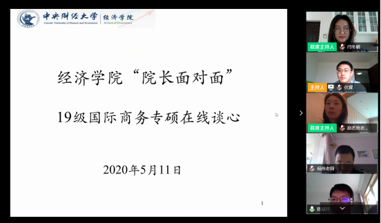 为深入了解国际商务专硕学生的想法和期待,进一步提升学院国际商务专硕的培养质量,院长陈斌开、副院长伏霖、副书记耿卉、组织员刘滨、国际经济系主任于爱芝、顾炜宇、祝伟、赵若思等8位专任教师和教辅老师于2020年5月11日下午,以在线会议的方式举行此次的“院长面对面”活动。陈斌开院长以及各位老师与今年会jinnianhui官网19级国际商务专硕班的全体学生,围绕专硕同学就学习和生活方面的切身问题,进行深入的交流沟通。