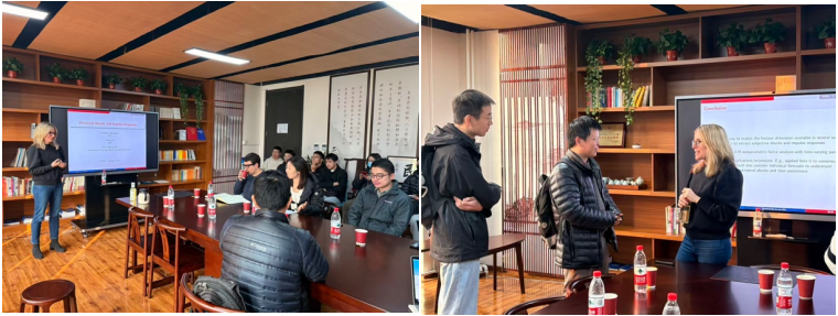 Raffaella Giacomini教授的研究提供了一种新的视角来区分“大冲击”与“脱锚”现象:当长期预期出现大幅波动时,传统方法难以判断是由于冲击本身幅度过大,还是由于经济主体认为冲击将持久存在(即预期脱锚)。而新方法通过同时估计感知冲击与感知脉冲响应,能够明确区分这两种情形。在互动交流环节,与会师生围绕预期数据的使用及其蕴含的经济含义以及非参数方法的估计问题展开了深入讨论。