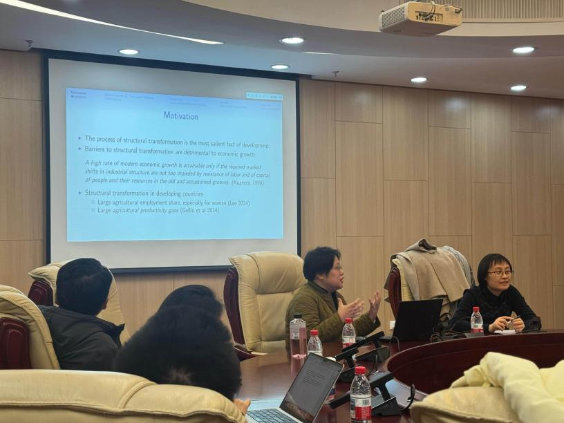 在报告中,陈婷副教授从制度经济学与中国经济发展实践相结合的视角出发,以中国土地制度改革为切入点,探讨土地市场摩擦如何制约劳动力流动与结构转型。为此,她结合2003年《土地承包法》配套政策以及2009–2019年土地确权登记两次关键改革,手工整理了4500余份地方政策文件,构建县级土地改革指数并据此开展准自然实验分析。研究结果显示,土地改革显著促进农村女性脱离农业,且女性退出比例显著高于男性,同时推动夫妻共同从事非农工作的比例上升;但由于劳动力替代效应,城市女性就业与工资相对受到一定抑制。进一步地,她通过建立包含夫妻劳动供给决策的两区两部门结构模型,解释了这一不均衡效应,并揭示土地权利保障在提升农业生产率与推动城乡要素流动中的关键作用及性别分布影响。