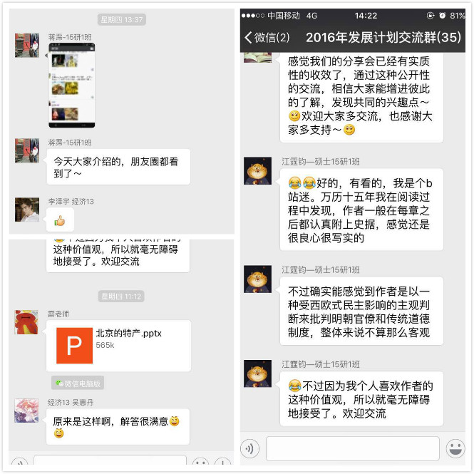 3月24日的分享会上,15级经济学班的任忱皓同学借日本动漫《CLANNAD》赏析分享了他对于友情和家庭的态度,阐明了他对“文化与历史”的思考,“历史的创伤有时间的重量,这一条岁月的长河里,看你舀起的是哪一段的水,就会喝到那一段独特的味道,我很难去评判过去,看到了糟粕但也该看到精华,如此才能不负历史不负中华”。4月5日的分享会上,15级国经管班来自新疆的田野同学则以具有异域特色的音乐开场,把新疆的美食美景、风土人情逐一、详尽地呈现给听众后,以动人的诗歌结尾,展现出他对家乡与民族团结的爱与向往——“我们没有什么不一样,我希望更多的人能够真正的去新疆看看,我们和大家一样,我们吃米饭,我们也爱交朋友,我们欢迎每一位兄弟同胞的到访,我们都是一家人”。4月14日,2015级硕士研究生、2016年党员发展对象江霆钧同学以“阅读”为题,将“读书”与“我”的介绍穿插融合,以新颖的方式分享了《走在人生边上》、《万历十五年》等阅读书目,以点带面地将自己长久积累的阅读方法和心得感悟深入浅出地阐述出来,激发了同学们内心深处对阅读的渴望。同样列入今年发展计划的15级硕士研究生苏婷同学,则带领大家神游了美丽的海滨城市厦门,重点介绍了自己的本科母校——厦门大学,从思明校区到漳州校区再到翔安校区,同学们“眺望”了厦门的海,“穿越”了厦大的芙蓉隧道,“嗅到”了6月飘洒的凤凰花,感受到了不同的大学气息。