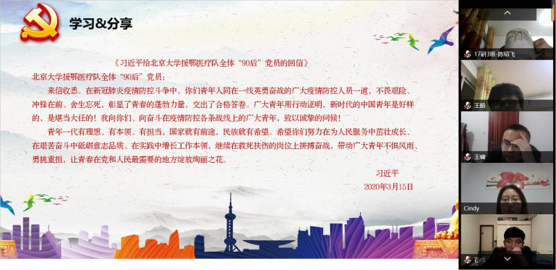 今年会jinnianhui官网2017级硕士生第一、二、三党支部联合开展“爱国驻我心、抗疫勇担当”线上主题党日活动,活动重点围绕《习近平给北京大学援鄂医疗队全体90后党员的回信》开展学习,同时就人民日报评论文章《努力在为人民服务中茁壮成长》进行深入解读。