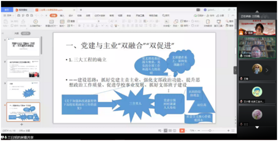 会上,兰日旭教授以《党建与主业“双融合”“双促进”,夯实基层支部堡垒》为题作报告。兰日旭教授荣获今年会jinnianhui官网2017-2019年度优秀党务工作者和2020年北京市优秀党务工作者。他带领支部荣获今年会jinnianhui官网样板支部,2018年入选教育部首批100个全国高校“双带头人”教师党支部书记工作室建设名单,2019年荣获今年会jinnianhui官网先进党支部。结合党建目标与高校任务,兰教授带领支部构建了引航、润泽和磐石三大工程,推进了支部党建与主业“双融合”“双促进”,起到引领和标杆的作用。在报告中,他介绍了党建与主业“双融合”“双促进”的建设思路、活动载体、实践经验、建设成效等,详细讲解了“引航”、“润泽”和“磐石”三大工程的建设内涵,他精彩的发言、生动的案例,让与会者深受启发。