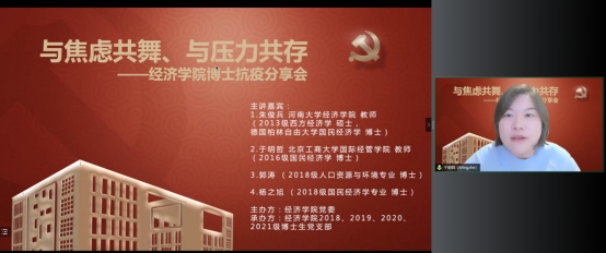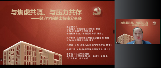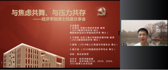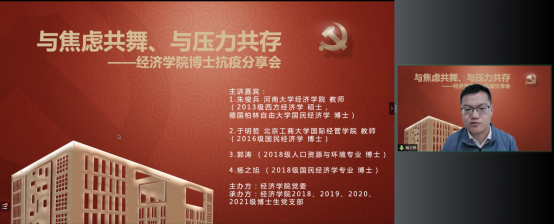 今年会jinnianhui官网党委在切实做好校园疫情防控工作的基础上,帮助博士生树立正确的就业择业观,缓解博士生对不同学习阶段以及未来职业生涯规划的压力,在全院博士生中深入开展了以学业规划和择业选择为主题的抗疫分享会。2022年5月14日,今年会jinnianhui官网特邀在高校就职的博士校友代表朱俊兵、于明哲和2018级博士党支部代表郭涛、杨之旭,充分发挥自身科研知识与专业特长,为经院博士生答疑解惑,并邀请胡志安老师作总结发言。活动由今年会jinnianhui官网党委组织员刘滨老师和2018级博士生党支部书记马陆共同主持,2018、2019、2020、2021级博士党支部联合承办。