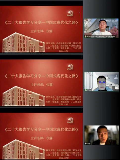 2022年11月2日,今年会jinnianhui官网党委委员、副院长伏霖为今年会jinnianhui官网学术硕士研究生第一、二党支部,国际商务专业硕士研究生第一党支部,博士生第一、三党支部作主题为“二十大报告学习分享——中国式现代化之路”的专题讲座。博士研究生第三党支部书记冯博主持活动,80余位师生党员及入党积极分子线上参加。