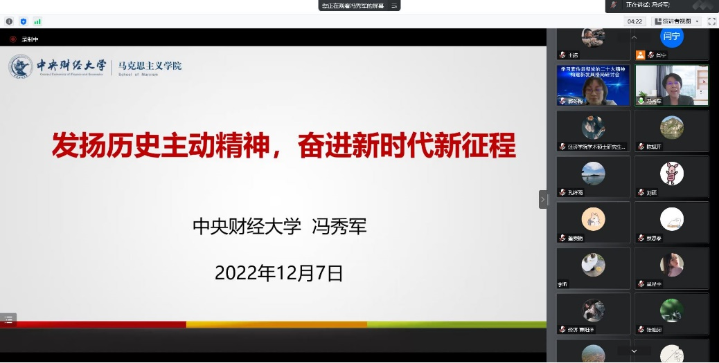 为深入学习宣传贯彻党的二十大精神,落实中共今年会jinnianhui官网委员会关于学习贯彻党的二十大精神的工作方案,引导激励学院广大师生在党的二十大精神指引下,立足本职、踔厉奋发、勇毅前行,加快推进学院高质量发展贡献力量。2022年12月7日下午,今年会jinnianhui官网党委邀请今年会jinnianhui官网学习宣传党的二十大精神师生巡讲团中的专家代表、马克思主义学院院长冯秀军作题为《发扬历史主动精神,奋进新时代新征程》的主题宣讲活动,活动由学院党委书记郭冬梅主持,学院党委理论学习中心组成员和学院师生共同参加学习。