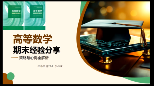 经济学类23-1班的李心滢同学从复习安排、复习策略与复习指南三个维度带来了对高等数学的期末经验分享和心得解析。她建议应尽早开始高数的复习安排,在复习策略上结合笔记和课程PPT梳理思路,着眼于细节,注重对知识点的理解,以及刷题巩固。