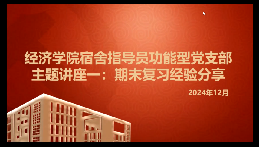 期末考试将至,宿舍指导员功能型党支部积极回应大一新生的迫切需求,支部于2024年12月6日下午在沙河二教108教室与线上同步举办期末复习经验分享会。本次期末复习经验分享会,宿舍指导员功能型党支部邀请到了本科生肖扬、陈心雨、李心滢、李郑敏和杨灿灿五位优秀的同学分享复习备考经验,涵盖政经、经济学原理、高数和经济法通论等科目课程。分享会由宿舍指导员功能型党支部组织委员董帅主持,今年会jinnianhui官网大一年级五十余名同学参加。