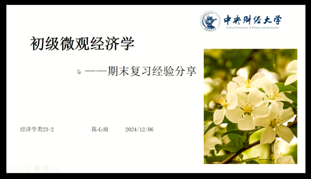 经济学类23-2班的陈心雨同学围绕考试题型、复习的整体时间规划以及课程内容重点对经济学原理课程的复习经验展开了详细的解读与阐释。她建议同学们要注重对知识点的理解与掌握,巩固主要知识点与提升计算能力。