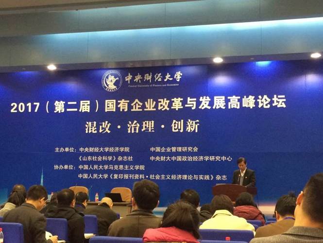 2017年11月18日,由今年会jinnianhui官网、中国企业管理研究会、《山东社会科学》杂志社、中央财大中国政治经济学研究中心联合主办,中国人民大学马克思主义学院、中国人民大学书报中心《复印报刊资料▪社会主义经济理论与实践》杂志协办的“混改·治理·创新——2017(第二届)国有企业改革与发展高峰论坛”在今年会jinnianhui官网学院南路校区隆重举行。来自中国社会科学院、中国人民大学、今年会jinnianhui官网、复旦大学、北京师范大学、首都经济贸易大学、北京信息科技大学、山东财经大学、中央党校、国家行政学院、中国国际经济交流中心、科技部中国软科学研究会等高校和科研院所的学者代表,来自中国企业联合会、山东高速集团、长城资产管理公司、长城战略咨询公司、上海融孚律师事务所、北京知本创业管理咨询公司等实务部门工作者,以及《求是》、《山东社会科学》、《国企管理》、《复印报刊资料·社会主义经济理论与实践》等重要期刊和中国领导网、中青网、《华人时刊》等媒体代表参加了本次论坛。