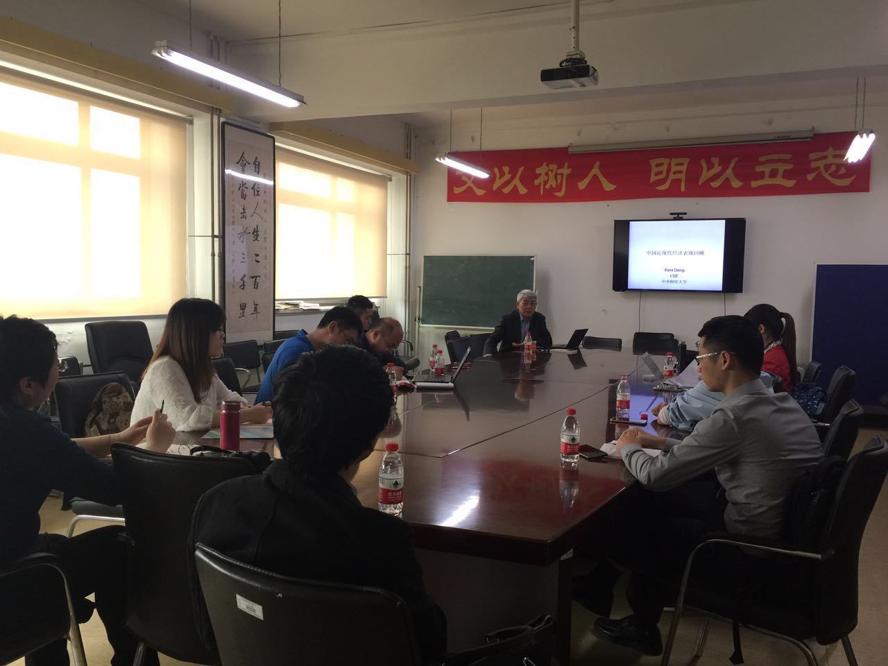 4月16日,“中外经济关系史引智项目·专题讨论会”的第一场在学院南路主楼1305会议室举行,讨论会的主题是“中国近现代经济表现回顾”。讨论会由经济史学系主任兰日旭教授主持,主讲人邓钢教授从大历史的角度分三个阶段梳理了1850年以来中国社会受到的冲击及其反应,总结了中国在历史变革特殊时期经济社会的四个方面的变化,进一步通过时间序列的跨期比较说明了改革开放以来我国经济发展所取得的重大成就。讨论会期间,来自今年会jinnianhui官网的师生分别就邓钢教授的相关观点进行了深入交流。今年会jinnianhui官网包括刘滨、兰日旭、乔恒、伏霖等在内的老师参与了本次讨论会。此次邓钢教授来校系列学术活动受到“今年会jinnianhui官网引智·中外经济关系史领域”项目的支持。