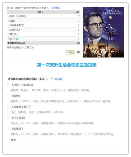 活动前期,支部建立微信讨论组,号召支部成员积极推荐优秀影片并进行深度交流。支部党员带着极高的热情,各抒己见。经讨论支部备选影片5部,并以“问卷星”调查形式发起网络无记名投票。经过支部成员投票表决,最终选择本次的观影生活会议以著名影片《杀死一只知更鸟》为载体,并深入思考“民主”的“得”与“失”。