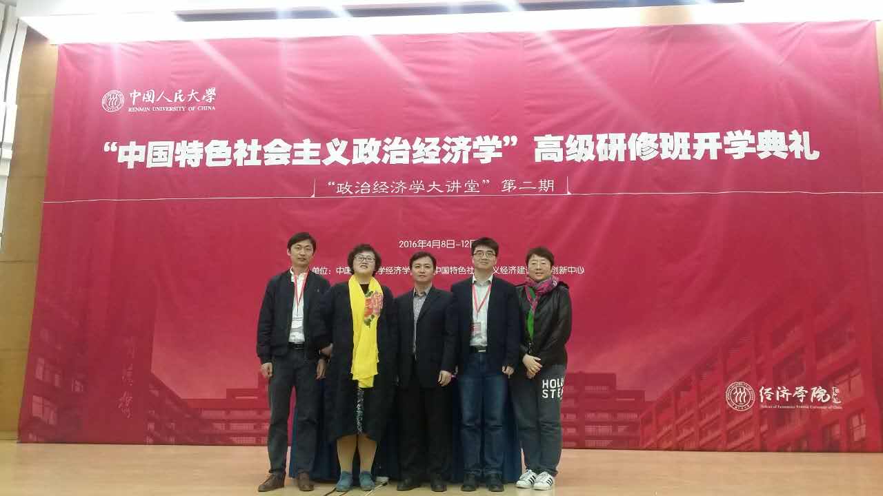 2016年4月8日到4月12日,我校今年会jinnianhui官网教师刘滨、张维闵、顾炜宇、尹志锋、何召鹏参加了由中国人民大学今年会jinnianhui官网与中国特色社会主义经济建设协同创新中心联合主办的“中国特色社会主义政治经济学”高级研修班。本期高级研修班以中国特色社会主义政治经济学为主题,深入探讨中国特色社会主义经济建设中重大理论现实问题。