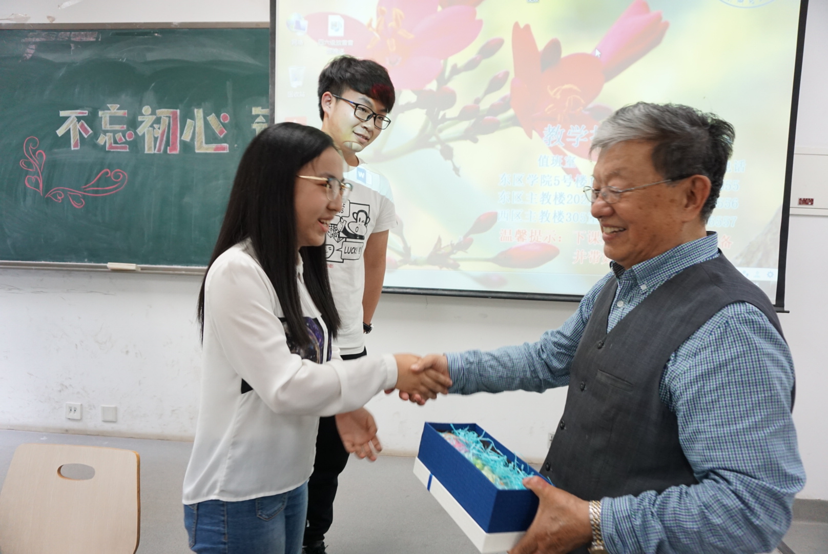 最后,同学们向侯教授展示了大家为欢迎与感谢侯教授特别准备的班级视频,团支书刘博和班长王文轩代表全班同学向侯教授送上了定制明信片和同学们亲手折制的许愿星,感谢侯教授对国民经济管理同学们的牵挂与关怀,祝福侯教授身体康泰、幸福安康。