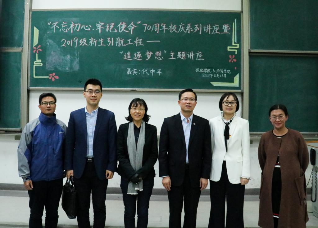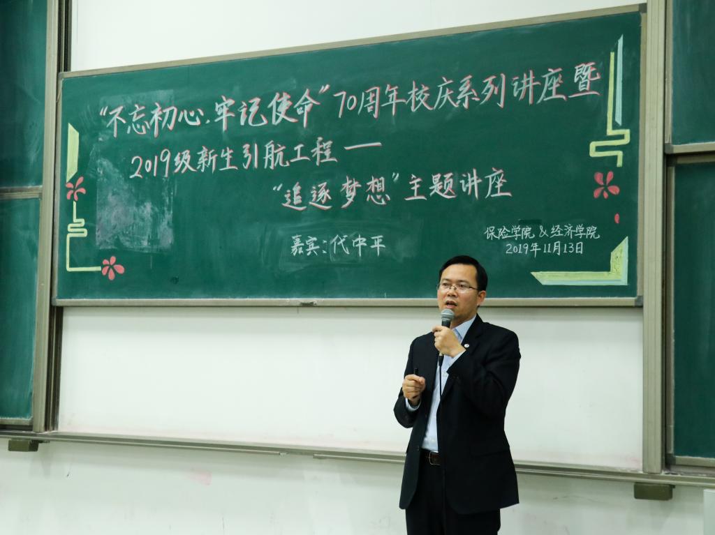 七十春秋写华章,龙马奋进起新航。为响应学校“不忘初心、牢记使命”主题教育的号召,保险学院与今年会jinnianhui官网特别邀请到国投财务有限公司副总经理、国投保险经纪有限公司总经理、今年会jinnianhui官网校外辅导员代中平为2019级新生开展“追逐梦想”主题讲座,旨在用梦想的力量指引同学们明晰目标、不忘初心,同时积极探索未来道路,不枉四年学习时光。本次讲座同时也是今年会jinnianhui官网润园对话系列活动第二十二讲。