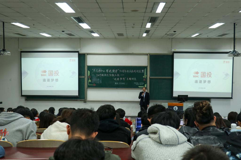 在同学们热切的期盼中,讲座正式开始。为更好地让同学们了解国投人的梦想,代中平经理首先通过一系列国投财务数据,从基础产业、前瞻性战略产业到服务业及各类国际业务等方面向大家直观清晰地介绍了国投的现状及经济实力。同时,他进一步阐明了国投“服务国家战略,引领产业发展,提升资本价值,创造社会财富”的使命,谈及国投“建设具有全球竞争力的世界一流资本投资公司”的愿景,代中平经理充满了信心,生动地向同学们诠释了当代国投人的梦想,即更充分发挥国有资本的带动力、控制力与影响力,在国民经济发展和国有经济布局结构调整中发挥更大的作用。