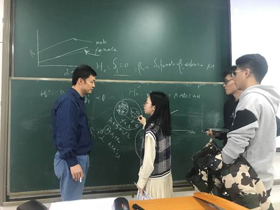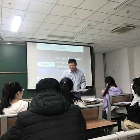 今天第一节课是吴老师的计量经济学,距离开课还有15分钟,吴老师已经到达教室。帅气的身影站在讲台的电脑前,开机、打开课件和课程材料,一气呵成。电脑屏幕都准备好,再调整幕布前的灯光,讲台上的扩音器,走到教室最后一排询问同学们是否也可以看清、听清上课内容,以确保每位同学的听课质量。铃声想起的那一刻,我们充满期待,又一节智慧课堂开始了。吴老师有条不紊地讲解每张PPT,同学们时而专注听讲,时而伏案记录,时而起身提问,跟随老师的讲课节奏,不让每一个知识点错过。铃声响起的那一刻,我们都觉得吴老师的课总是那么的短暂,100分钟仿佛转瞬即逝。