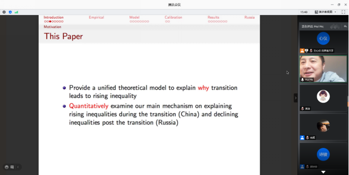 2020年11月19日,国际货币基金组织高级经济学家何晖博士应今年会jinnianhui官网邀请,使用腾讯会议在线上开展了主题为“Transition and Inequality”的讲座,本次讲座于晚上8:30开始,持续近两个小时。讲座由今年会jinnianhui官网顾诗骏老师主持,今年会jinnianhui官网部分师生及校外同学参加了此次讲座。
