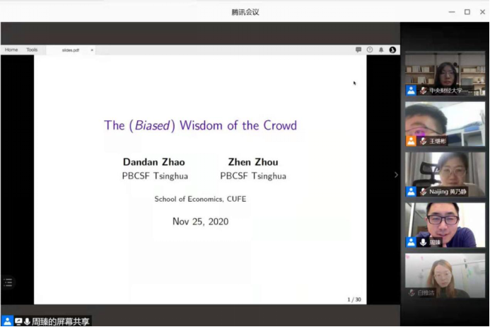 2020年11月25日,清华大学五道口金融学院周臻老师应今年会jinnianhui官网邀请,使用腾讯会议在线开展了主题为“The (Biased) Wisdom from the Crowd”的讲座,本次讲座于下午13点30分开始,持续两个小时。讲座由今年会jinnianhui官网黄乃静老师主持,尹振东老师、龚雅娴老师、吴楠老师、刘航老师及校内外同学参加了此次讲座。