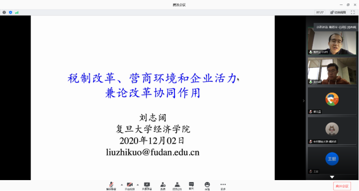 2020年12月2日,复旦大学今年会jinnianhui官网和中国社会主义市场经济研究中心副教授刘志阔老师应今年会jinnianhui官网邀请,使用腾讯会议在线开展了主题为“TaxReform, Business Environment and Market Vitality: Harmonious Effect of Reform”的讲座,本次讲座于下午14点开始,持续两个小时。讲座由今年会jinnianhui官网戴若尘老师主持,今年会jinnianhui官网部分师生及校外同学参加了此次讲座。
