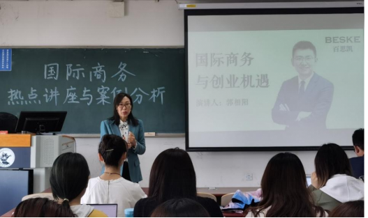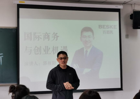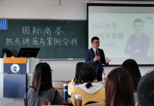 2021年4月8日,《商务热点讲座与案例分析》课程正式开启。上海百思凯国际贸易有限公司的董事长郭相阳作为首场主讲人,在当前中国所处的国际环境背景下结合自身创业经历,向国际商务专业的同学们分享了自己过去将近7年的创业经验和对未来国际市场的看法,并与同学们进行了深刻的交流。