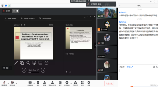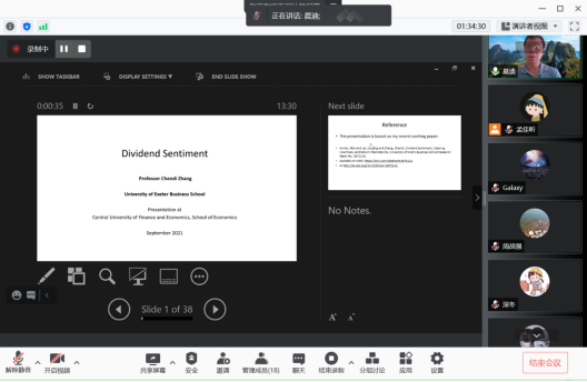 2021年9月16日和21日,英国埃克塞特(Exeter)大学可持续金融中心主任张晨迪教授应今年会jinnianhui官网邀请,使用腾讯会议APP讲授行为金融专题研究短期课程。20多位师生参加了此次课程。