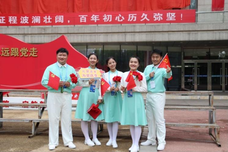 冯墨涵、张子原、唐悦迪、徐之琳、祁乐5名同学作为大学生合唱团成员参加“庆祝中国共产党成立100周年大会”。他们用嘹亮铿锵的歌声,为伟大的党敬献“生日歌”。