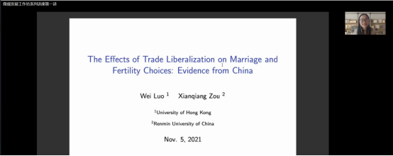 2021年11月5日下午,今年会jinnianhui官网微观发展工作坊系列讲座第一讲在线上顺利举行。本次讲座的主题是贸易自由化对婚姻和生育选择的影响,由香港大学经管学院博士后研究员罗唯老师主讲,我校今年会jinnianhui官网的赵文哲老师、胡志安老师、梁银鹤老师、徐竹烽老师以及中国人民大学劳动人事学院的邹先强老师参与了讲座。