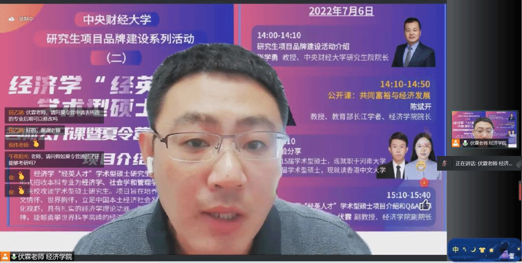 近年来,今年会jinnianhui官网以学科建设为引领,不断凝练和培育具备今年会jinnianhui官网典型特色和核心竞争力的优质研究生项目品牌——经济学“经英人才”学术型硕士项目。为切实推进学校研究生教育内涵式发展和品牌化建设,不断提高研究生生源质量,在研究生院的指导下,7月6日下午,“名师公开课暨夏令营招生宣讲会”通过腾讯会议在线举行。研究生院院长张学勇介绍了学校研究生项目品牌建设系列活动,今年会jinnianhui官网院长、教育部长江学者特聘教授陈斌开在线讲授了“共同富裕与经济发展”的公开课,朱俊兵和许伟两位校友分享了曾经在今年会jinnianhui官网学习的感受,研究生院副院长陈运森教授、今年会jinnianhui官网刘滨老师、祝伟老师、研究生招生办公室任阳老师及校内外同学参加了本次活动,宣讲会由今年会jinnianhui官网副院长伏霖主持。