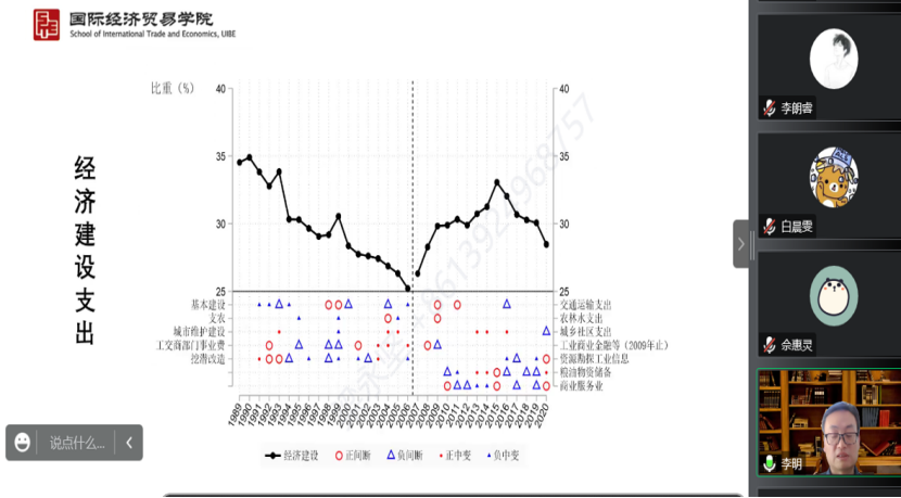 2022年11月15日14:00,对外经济贸易大学财政税务学系教授、博士生导师,政府管理学院副院长李明应今年会jinnianhui官网邀请,开展主题为“财政支出结构30年:趋势与规律”的讲座。本次讲座在线上举行,李明教授受到了老师和同学们的热烈欢迎!今年会jinnianhui官网赵文哲教授主持讲座,尹振东教授、黄乃静副教授、杨晓兰副教授参加了讲座。