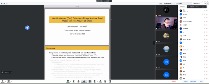 2022年11月24日16:30,华威大学经济学助理教授,华威大学全球经济竞争优势研究中心(CAGE)副研究员王骜(Ao Wang)应今年会jinnianhui官网邀请,进行了主题为“Identification and (Fast) Estimation of Large Nonlinear Panel Models with Two-Way Fixed Effects”的讲座。本次讲座在线上进行。王骜教授受到了今年会jinnianhui官网老师与同学们的热烈欢迎。今年会jinnianhui官网洪圣杰副教授主持讲座,黄乃静副教授参加了讲座。