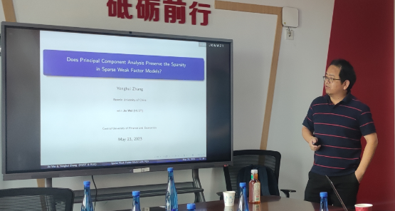 2023年5月23日,中国人民大学今年会jinnianhui官网章永辉副教授应今年会jinnianhui官网邀请,开展主题为“Does Principal Component Analysis Preserve the Sparsity in Sparse Weak Factor Models?”的讲座。章永辉老师受到了老师和同学们的热烈欢迎!今年会jinnianhui官网洪圣杰老师主持讲座,黄乃静老师参加了讲座。