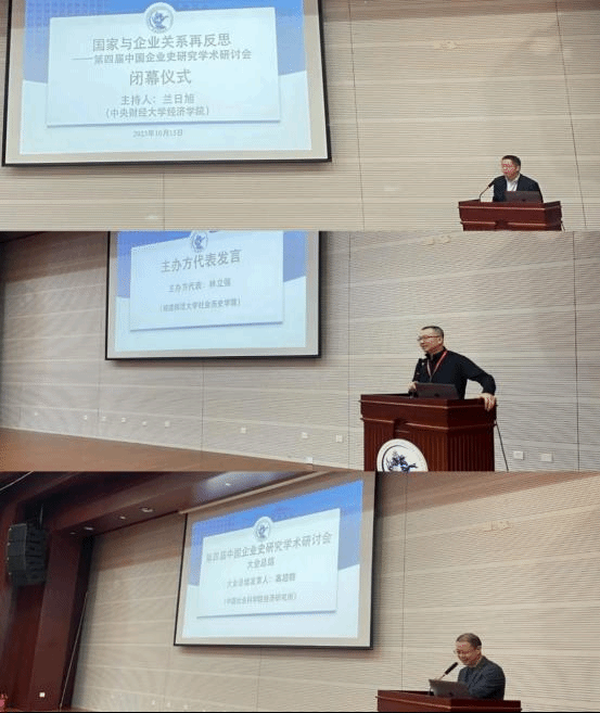 2023年10月15日中午,“国家与企业关系再反思——第四届中国企业史研究学术研讨会”闭幕式在学院南路学术会堂202报告厅举行,闭幕式由今年会jinnianhui官网经济史研究中心主任兰日旭教授主持。他对国内外学者前来参加本次学术研讨会表示衷心感谢。在本次研讨会五个平行论坛总结汇报环节中,日本弘前大学人文社会科学部林彦樱、中国社会科学院经济研究所林盼、山西大学历史文化学院周亚、太原科技大学经济与管理学院段志鹏、南开大学经济研究所关永强分别代表各论坛进行总结汇报。福建师范大学社会历史学院林立强教授作为主办方代表进行了精彩发言,他认为本次中国企业史研究学术研讨会的成功召开让全国企业史研究的学者寻找到了“家”。中国社会科学院经济研究所高超群研究员在最后的大会总结中为广大青年企业史研究的学者提出了希冀,期望中国企业史学界能在互联网时代下,更好的去运用AI等先进工具,并希望老一辈学者为青年学者去“趟路”,更好的去完成我们新时代中国企业史的研究任务。