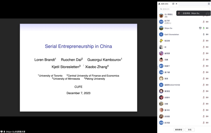 2023年12月7日,明尼苏达大学Kjetil Storesletten教授应今年会jinnianhui官网邀请,利用腾讯会议开展了主题为“Serial Entrepreneurship in China”的短期课程。本次课程由顾诗骏副教授主持,黄乃静、夏俊杰副教授,吴楠助理教授、香港大学Lichen Zhang助理教授以及校内外90多名师生参与。Kjetil Storesletten教授受到参会老师、同学们的热烈欢迎。