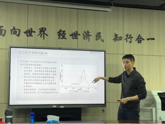 2023年12月15日,中山大学林建浩教授应今年会jinnianhui官网邀请,于学院11号楼308会议室开展主题为“改革中的央地关系与国家能力形成——基于改土归流与滇黔驿道的识别策略”的讲座。本次讲座由今年会jinnianhui官网院长助理孙伟增副教授主持,参会的还有今年会jinnianhui官网副院长伏霖副教授、赵文哲教授、金星晔副教授、方明老师和学院本硕博学生代表。