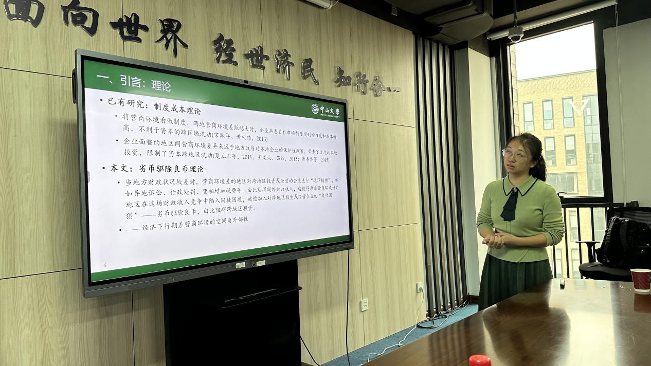 在问答环节中,刘毓芸副教授耐心回答了与会师生关于题目的选定、下行周期的界定、远洋捕捞动机的探究以及因果识别等方面的疑问,并分享了自己在营商环境政策研究领域的宝贵经验。