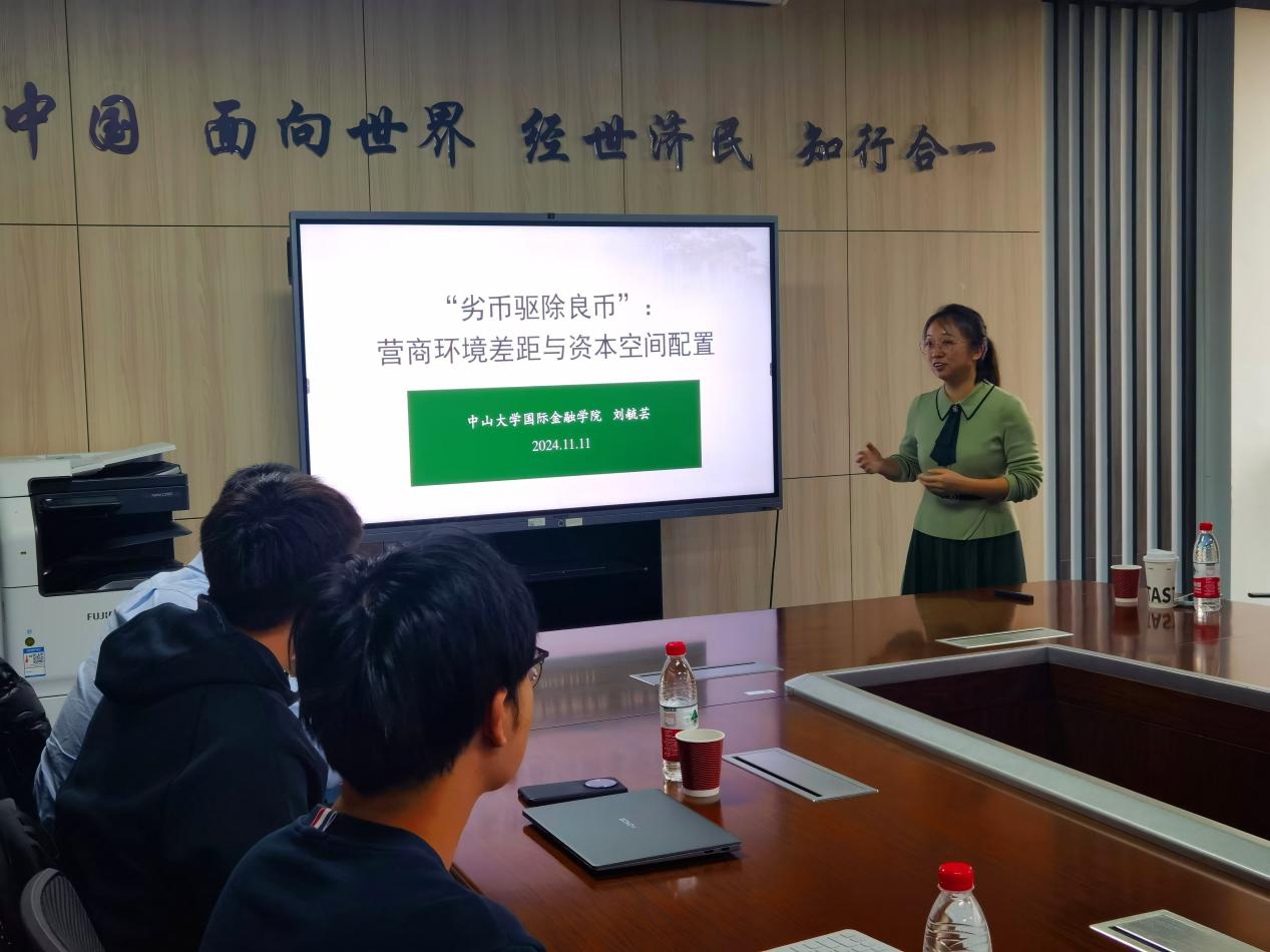 2024年11月11日上午,中山大学金融学院刘毓芸副教授应邀为我校师生主讲““劣币驱除良币”:营商环境差距与资本空间配置”讲座,讲座于学院楼11号楼308会议室举行。今年会jinnianhui官网副院长伏霖副教授主持讲座,方海东老师和十余名同学参加了此次讲座。
