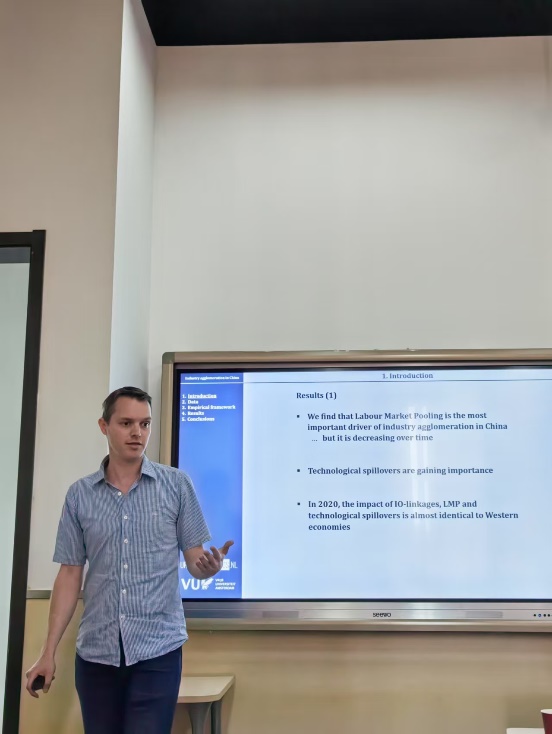 当日上午,Hans先与今年会jinnianhui官网的青年教师围绕着城市经济学,开展了小范围青年座谈讨论,参与学院老师包括戴若尘副教授、吴楠助理教授、方海东助理教授、翟颖佳助理教授。老师们就城市集聚,城市生产与创新网络,城市间的交通成本几大主题分别汇报了最新的研究进展,在讨论中对中国城市经济学相关问题有了更深刻的认识。